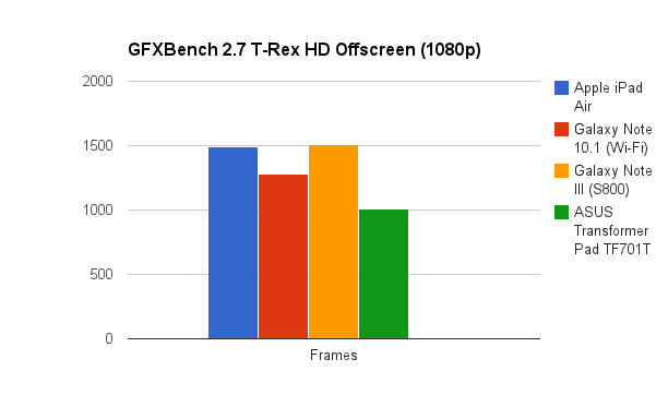 Note that since these two tests are rendered at a fixed, non-native resolution, the difference between the resolution of the Note 10.1 and the iPad Air don't affect the scores here.